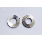 DIN6795是德国标准、该垫圈是一款法式锁紧垫圈的改良设计产品、表面条纹有预紧防松作用。垫圈的背面设计有六个爪形剌破角!主要功能是在配合螺栓螺钉拧紧时可以剌破金属基体表面!主要功能是剌破作用、因此也有人叫剌破垫圈、带爪触地垫圈!