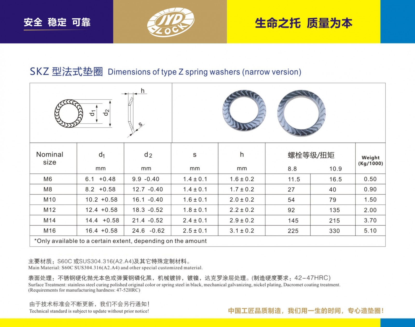 执行制造标准:SKZ锁紧垫圈规格:M6-M16为标准型号 ,根据客户需求可提供订制 主要钢质:SUS304.316、A2.A4及超级不锈钢等 硬化等级:HV350 符合10级强度。硬化抛光表面处理, 经有效测试800小时以上 完全符合欧盟ROHS标准、