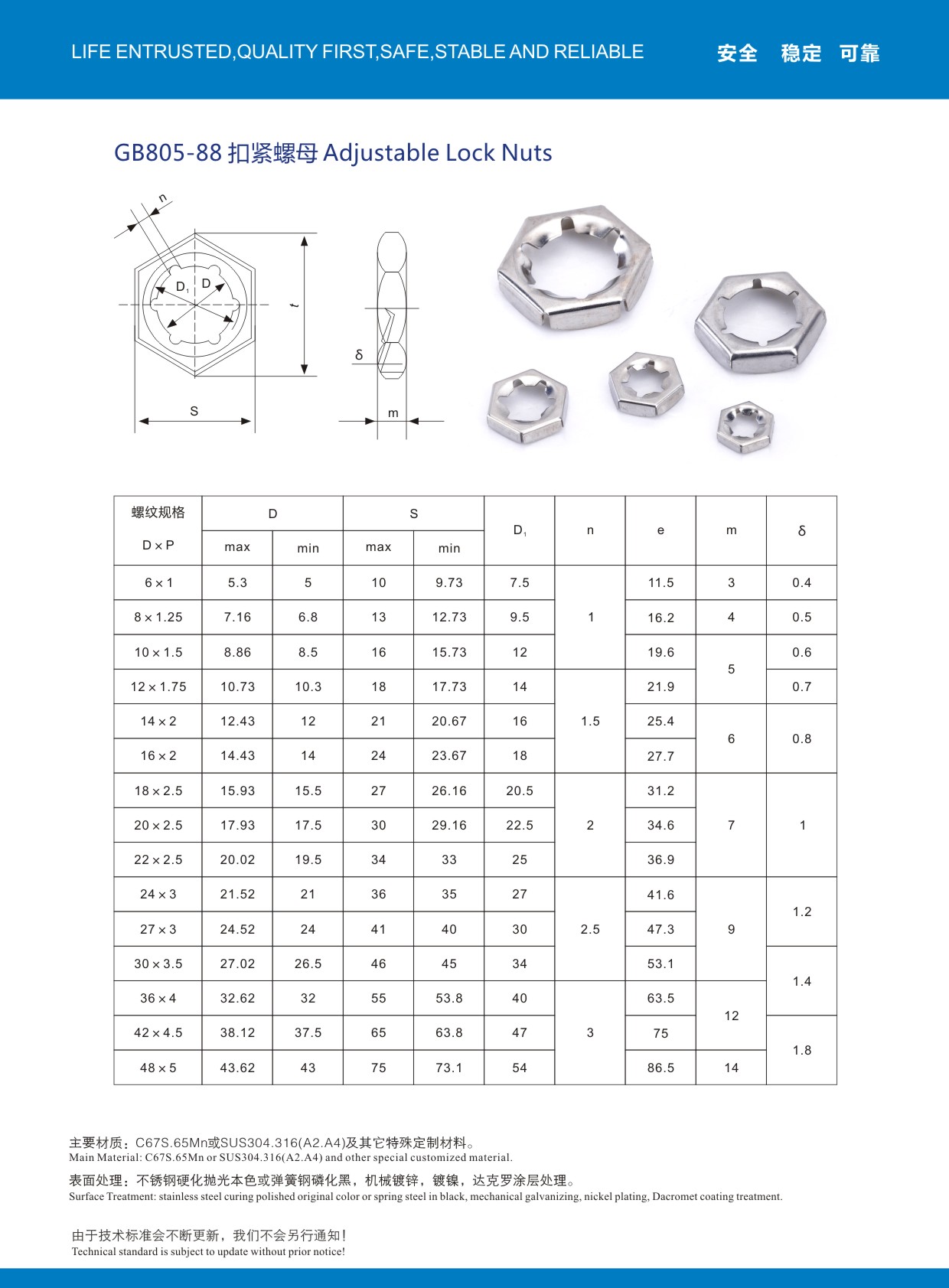 国标GB805扣紧螺母,65MN材质/硬化达克罗涂层处理!采用冲压工艺,常用M6-M48型号都有现货!JYD品牌扣紧螺母品质相对专业,功能及外观与一般性市面扣紧螺母有明显品质差别!欢迎索取样品比较!